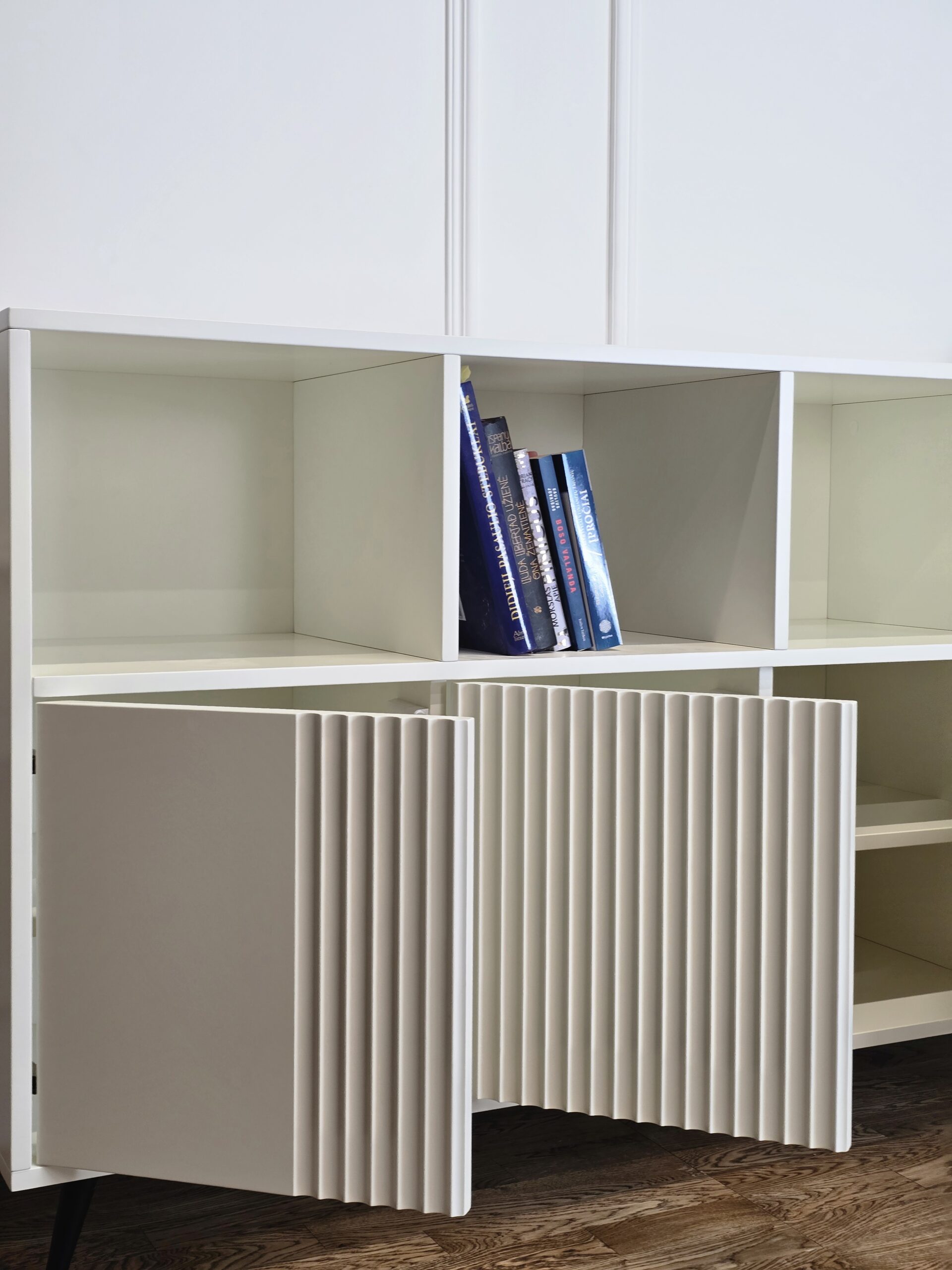 Komoda „Knygynas“ išsiskiria savo struktūra – viršutinėje dalyje esantys atviri skyreliai sukuria lentynų įspūdį ir leidžia patogiai eksponuoti knygas ar dekoracijas. Šis baldas puikiai tinka tiek svetainėje, tiek darbo kambaryje ar net hole – kur svarbu suderinti estetiką su praktiškumu.