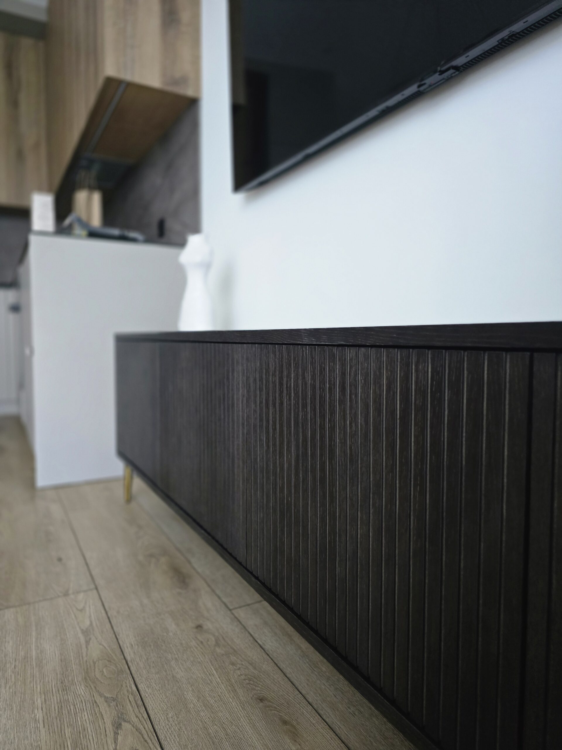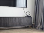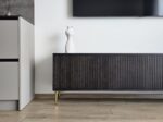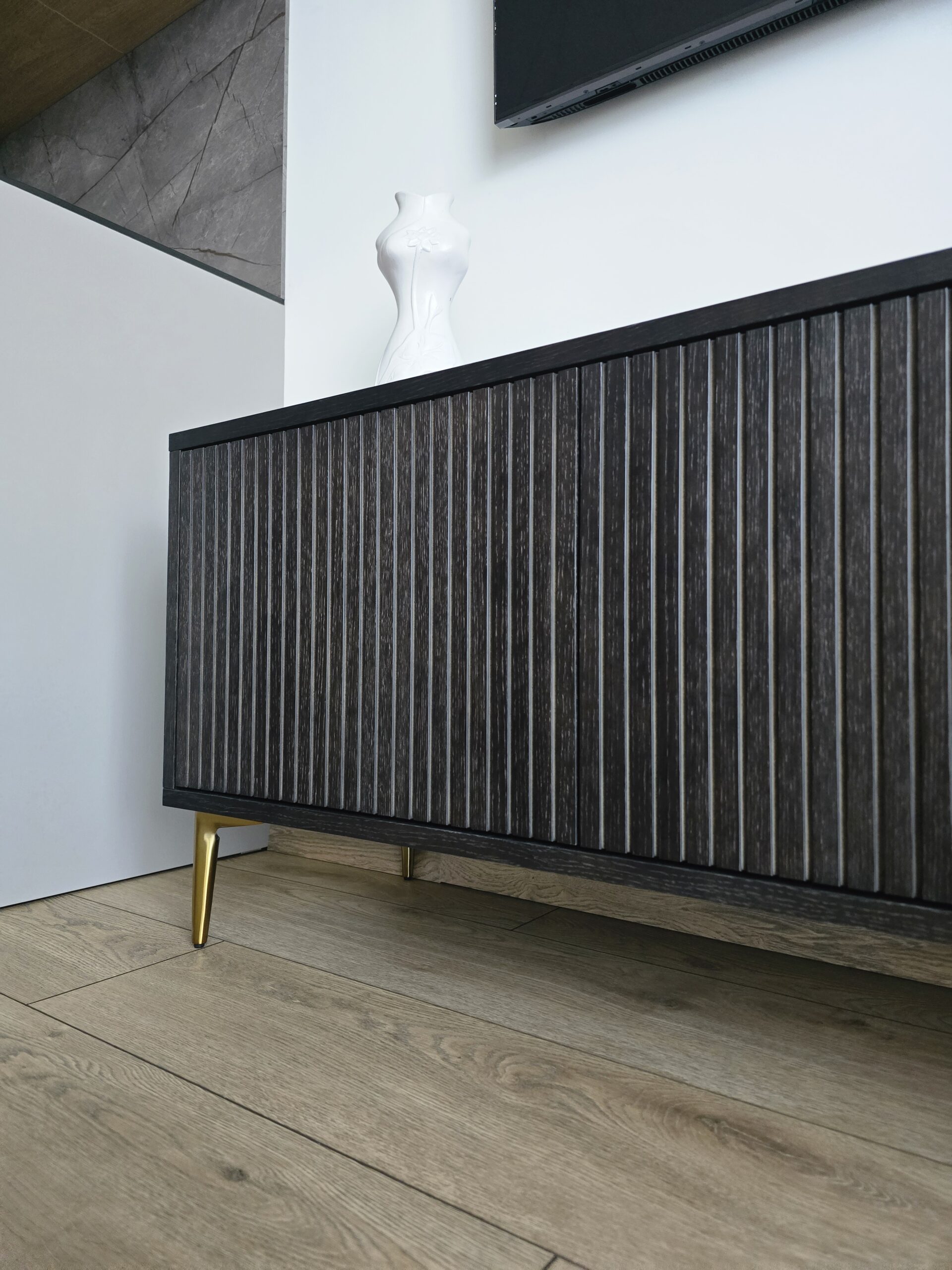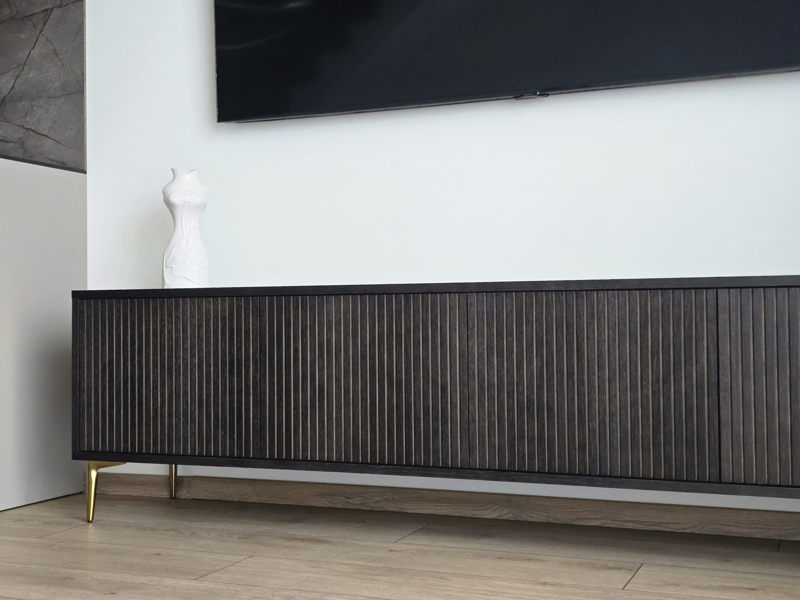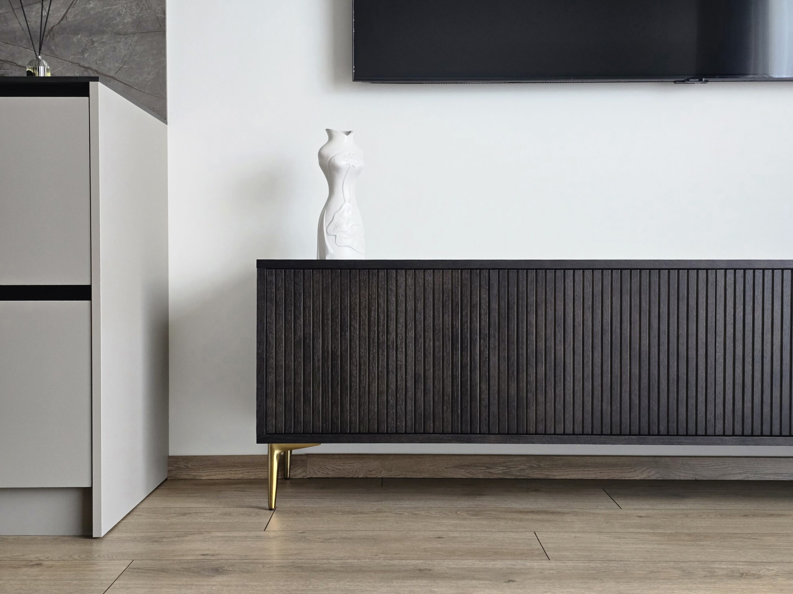 Šis TV baldas išsiskiria prabanga alsuojančiu tamsiu medžio lukštu (spalva MCO6045) ir išraiškingu vertikaliu reljefu. Kontrastingos auksinės kojelės suteikia baldui išskirtinumo ir rafinuoto žavesio. Dėl subalansuotos proporcijos bei švarių linijų baldas atrodo solidžiai, bet tuo pačiu lengvai įsilieja į erdvę.
