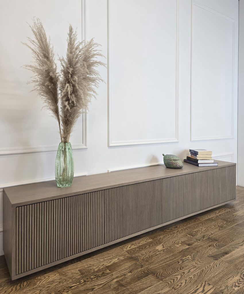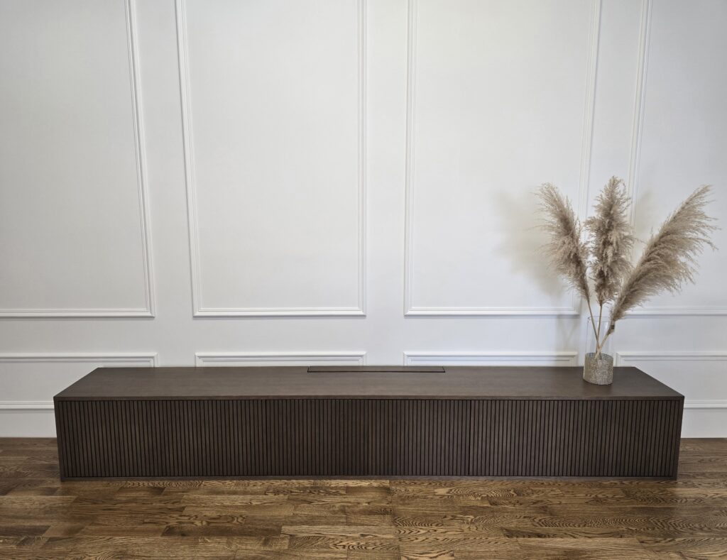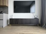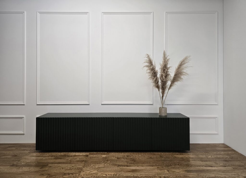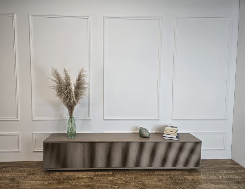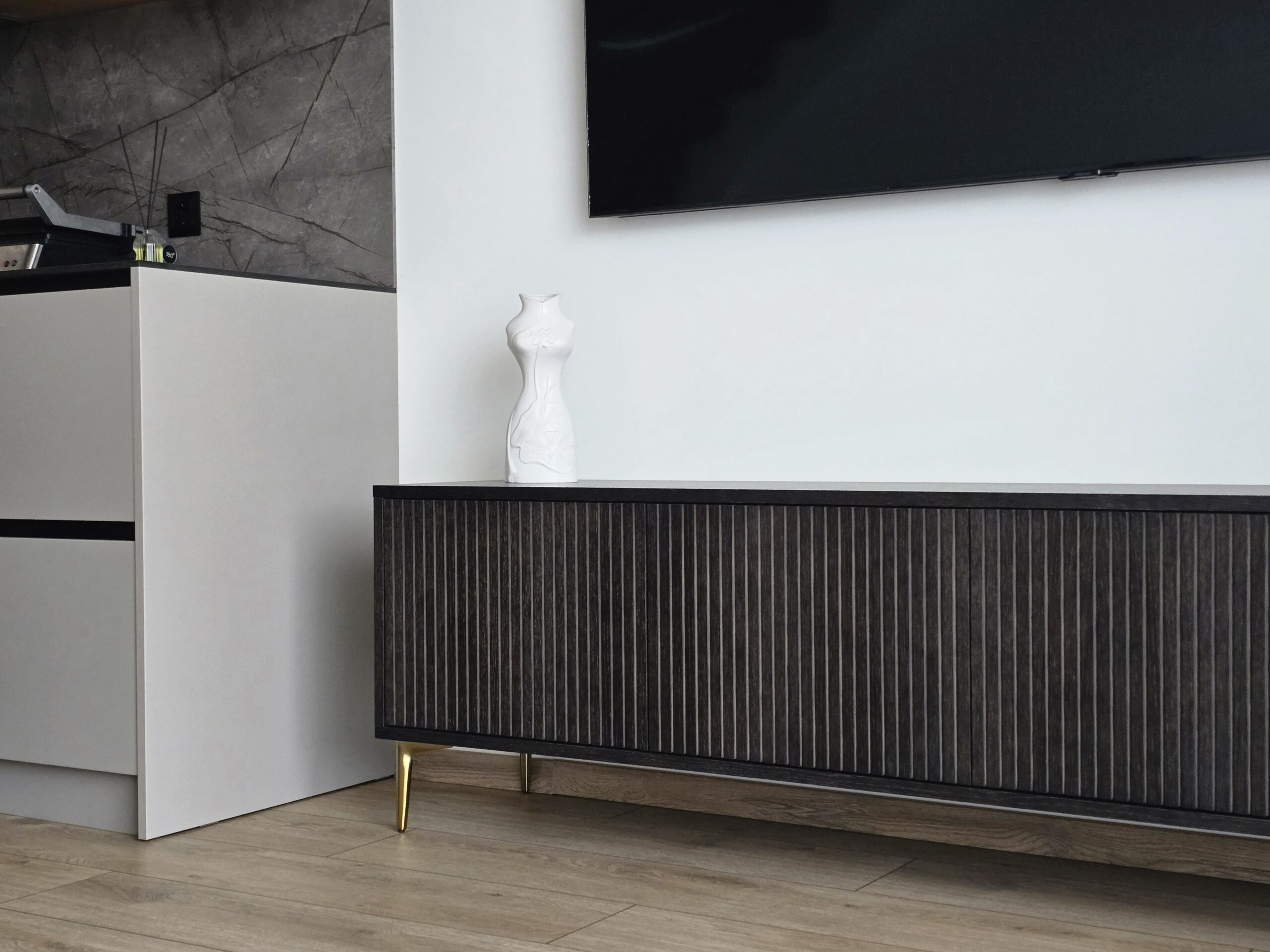 Šis TV baldas išsiskiria prabanga alsuojančiu tamsiu medžio lukštu (spalva MCO6045) ir išraiškingu vertikaliu reljefu. Kontrastingos auksinės kojelės suteikia baldui išskirtinumo ir rafinuoto žavesio. Dėl subalansuotos proporcijos bei švarių linijų baldas atrodo solidžiai, bet tuo pačiu lengvai įsilieja į erdvę.
